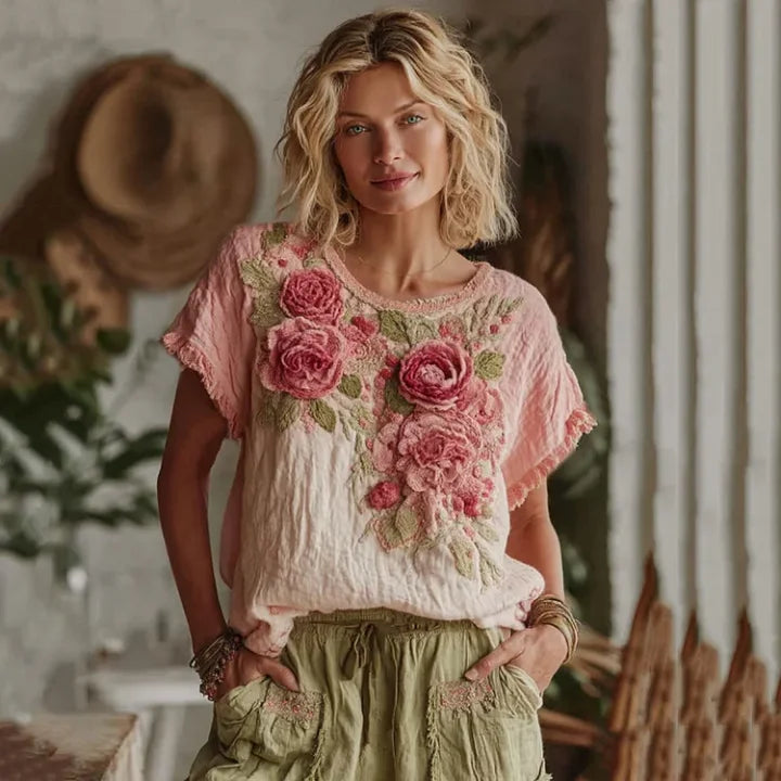 Women's Vintage Floral Oil Painting Art Gradient Cotton And Linen T-shirt