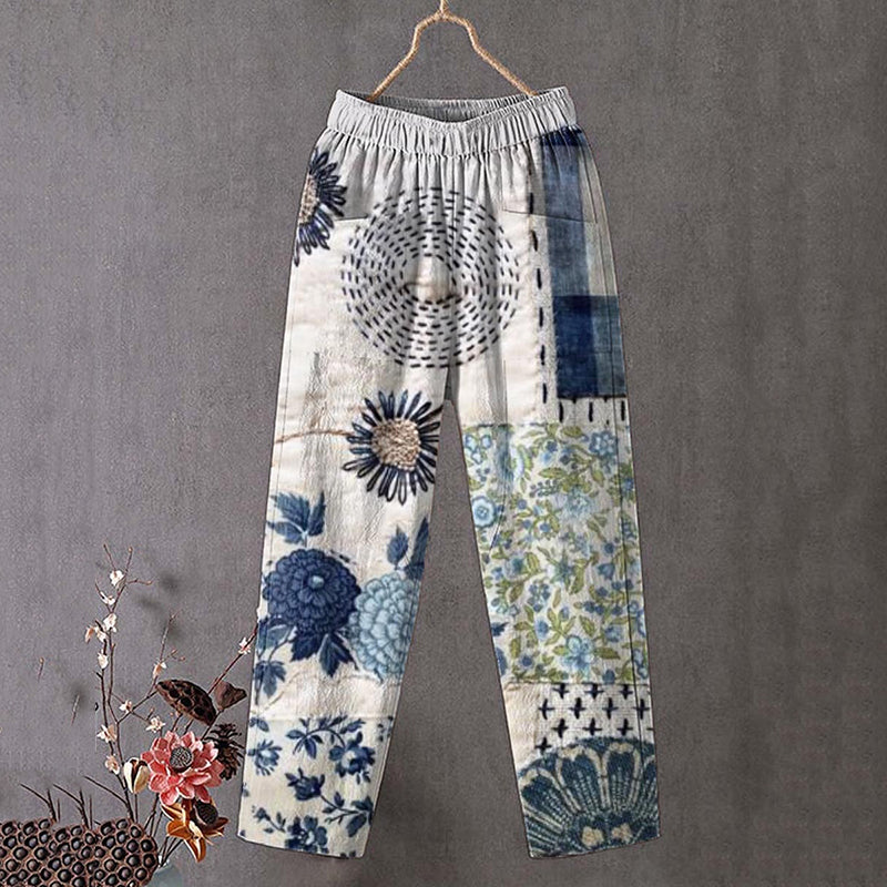 Japanese Flower Art Print Linen Blend Pocket Pants