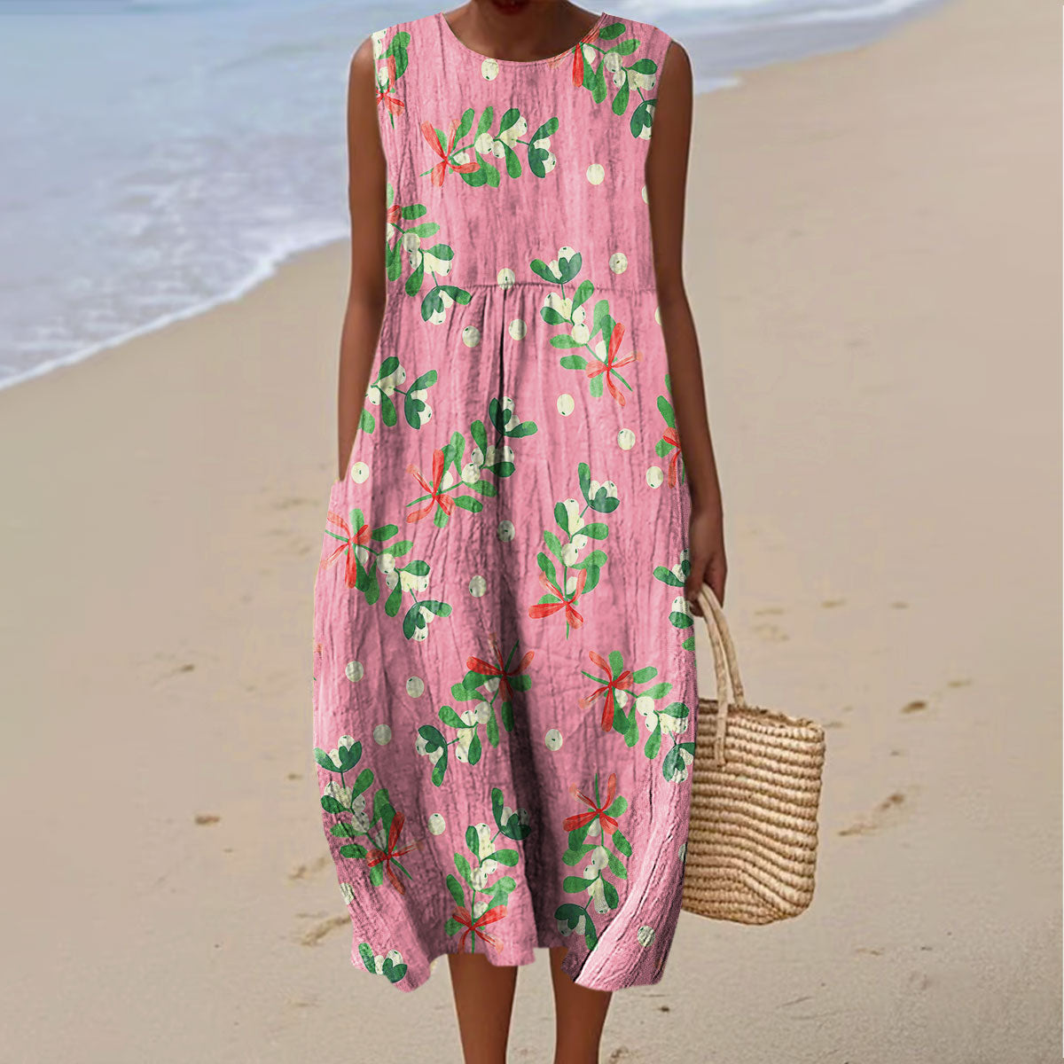 Women's Vintage Flower Art Print Sleeveless Cotton Pocket Wrap Dress